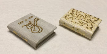 Lute and Lyre and other musical instruments of the 6th century A.D. Written by Miriam Irwin. Illustrations by Barbara Urban. © 1977 by Miriam D. Irwin, Mosaic Press, Cincinnati, Ohio. 1 1/8" ta;; with 48 pages. Bound in white leather with gold stampings of two different designs. $24